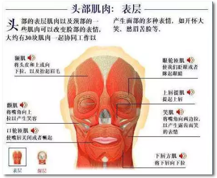 我們的表情,其實(shí)較主要是靠各種表情肌肉來(lái)實(shí)現(xiàn)的。表情肌的收縮、舒張,讓我們的表情有了對(duì)應(yīng)的變化。