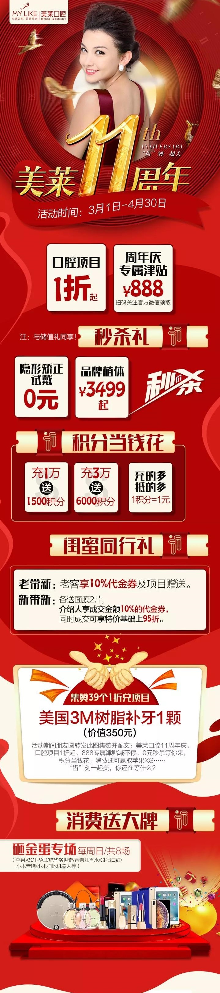美萊口腔11周年慶,口腔項目1折起,888專屬津貼減不停,0元秒殺等你來,積分當(dāng)錢花,消費還可贏取蘋果XS……“齒”刻一起美,你還在等什么?