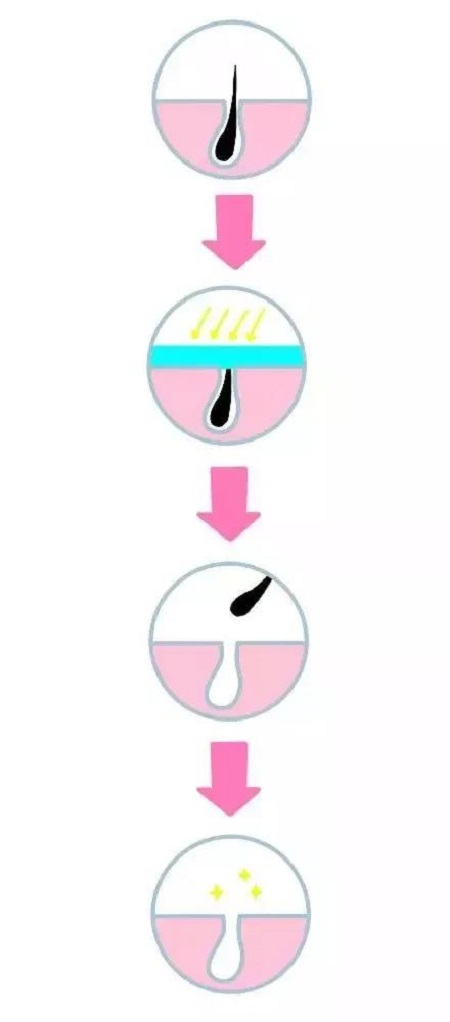 是這樣,我們的毛囊根部會有一團(tuán)黑色素,機(jī)器的激光就會打在毛囊旁的黑色素上,黑色素受熱溫度升高,毛囊凝固壞死,就達(dá)到了脫毛的效果。