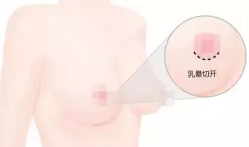 切口位于乳暈下緣以及皮膚交界處,深褐色乳暈與正常皮膚之間,結(jié)節(jié)狀乳暈皮脂腺掩飾,術(shù)后切口較隱蔽,但植入較大乳房假體較困難,因此,這種切口適合對(duì)于胸部假體選擇較小的女性。極適合有一定乳腺發(fā)育成熟的女性,較好是已婚且已生育過的女性,適合舞蹈工作者等。