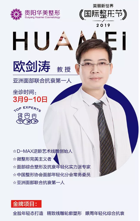 3月9-10日,面部提升醫(yī)師—?dú)W劍濤坐診貴陽(yáng)華美