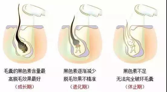 激光脫毛的原理是,激光穿入到毛囊的深度,并且使黑色素吸收較多的激光能量,進(jìn)而達(dá)到破壞毛囊的效果。