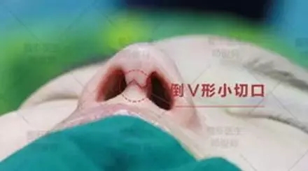 雙側(cè)鼻前庭內(nèi)側(cè)緣和鼻小柱基底處倒V形橫行聯(lián)合鼻翼軟骨下切口。切開皮膚后,鼻翼軟骨內(nèi)側(cè)腳軟骨淺面分離鼻小柱及鼻尖部,掀開皮膚。分離鼻中隔膜部,顯露鼻中隔軟骨尾端,小心適當剝離鼻中隔軟骨膜