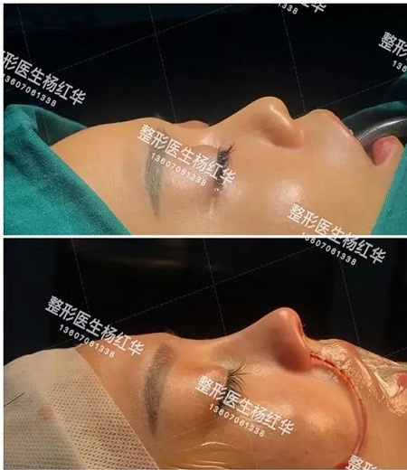 雕刻假體,假體支撐鼻部至鼻根部,假體尾端至于鼻翼軟骨外側(cè)腳之間。完成后縫合
