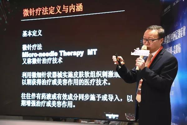 開始由鄭荃委員主任率先登場,開門見山地說了《微針中胚層療法在皮膚科臨床運用的價值》。對微針療法進行了全面的展述,包括微針療法所涉及到的儀器,治療的具體方法、微針的療法類型,療法應(yīng)用與規(guī)范。微針中胚層療法對于黃褐斑、痤瘡等色素性疾病的治療具有明顯的效果和優(yōu)勢。