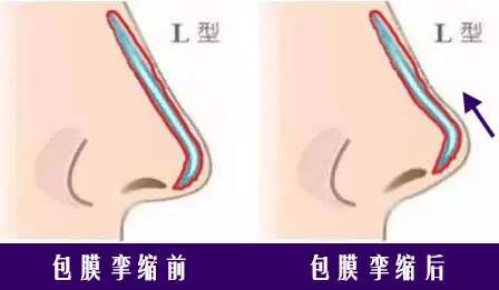包膜的攣縮就會(huì)造成硅膠假體的擠壓變短,而L型假體的形狀鼻梁部位和鼻尖部位是連在一起的,這時(shí)候假體遭到包膜的擠壓不僅鼻子會(huì)變短,連帶著鼻尖也會(huì)上翹變成朝天鼻。