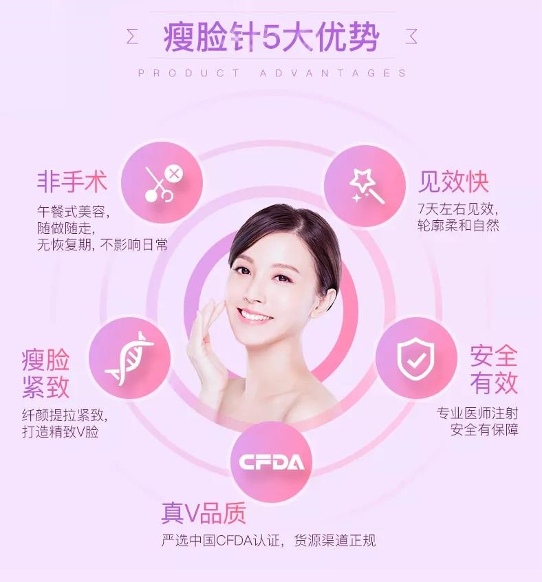 瘦臉是A型玻尿酸針劑,主要作用于肌肉組織,注射后減少神經(jīng)與肌肉的神經(jīng)沖動(dòng),讓過(guò)度收縮的肌肉松弛,麻痹過(guò)于發(fā)達(dá)的肌肉,達(dá)到瘦臉的作用,并非適合每一種臉型。