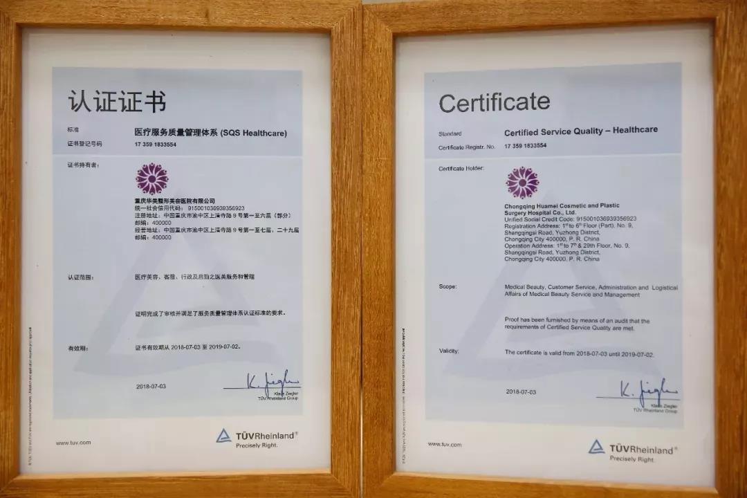 2018年7月20日,重慶華美作為重慶整形美容行業(yè)中,唯一通過德國萊茵TÜV-SQS服務質量管理體系認證授牌的醫(yī)美機構。2019年6月28日,重慶華美順利通過TüV-SQS復審,評審專家對重慶華美健全的醫(yī)療安全保障體系和良好的醫(yī)療服務品質給予的高度認可。