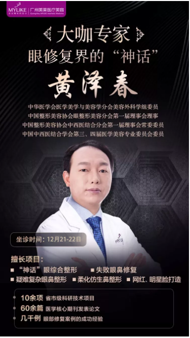 當前位置 : 美萊醫(yī)療美容醫(yī)院品牌連鎖 > 美萊新聞 > 2018年12月21-22日眼修復醫(yī)師「黃澤春」限量約診|“神話”眼整容
