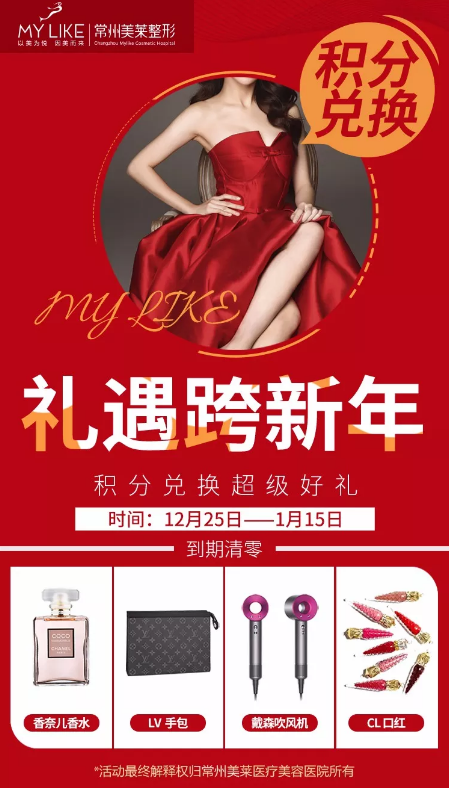 當前位置 : 美萊醫(yī)療美容醫(yī)院品牌連鎖 > 美萊新聞 > 12月25日-1月15日常州美萊禮遇跨新年倒計時|你的積分再不兌換就要過期了!