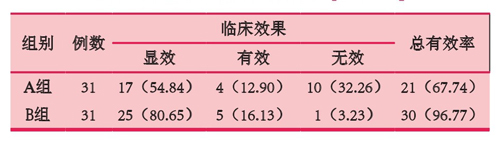 B組臨床效果優(yōu)于對(duì)A組差異有統(tǒng)計(jì)學(xué)意義(χ2=8.9 9 9,P=0.0 0 1),B組患者臨床總有效率(96.77%)顯著高于A組(67.74%),差異均有統(tǒng)計(jì)學(xué)意義(χ2=8.952,P=0.003)。見表2