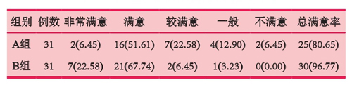 治療后,B組患者整體滿意度優(yōu)于A組,差異具有統(tǒng)計(jì)學(xué)意義(χ2=11.262,P=0.024)。A組患者總滿意率(80.65%)低于B組(96.77%),差異具有統(tǒng)計(jì)學(xué)意義(χ2=4.026,P=0.045)。見表3。