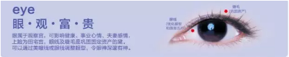 你的眼睛你的“財”:眼是神韻的傳達,是魅力的點綴,也稱觀察宮,可影響健康,事業(yè)心情,夫妻感情,上瞼為田宅宮,眼線及睫毛是鞏固固定資產(chǎn)的黛??梢酝ㄟ^美瞳線或眼線調(diào)整眼型,令眼神深邃有神。