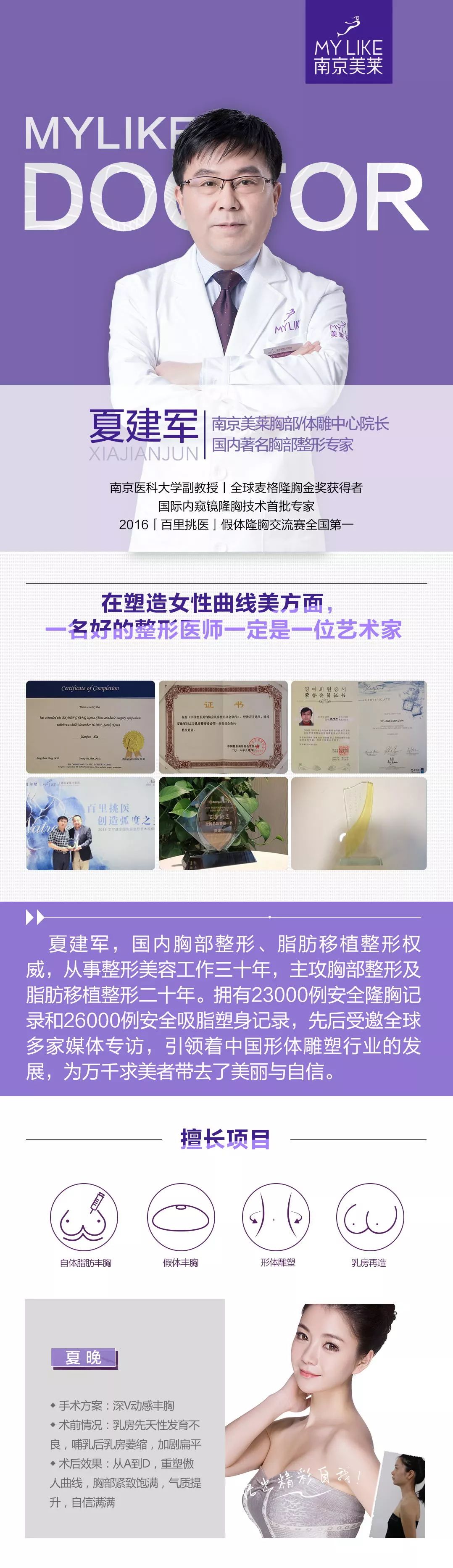 夏院長擁有十分精湛的專業(yè)技術,長期致力于塑造女性曲線美,在胸部修復、假體隆胸方面經驗豐富,業(yè)內有口皆碑。