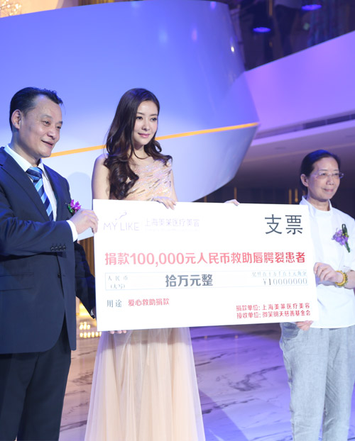 熊黛林同上海美萊醫(yī)療美容醫(yī)院院長(zhǎng)喻明一起,代表美萊將首筆愛心基金捐給了微笑明天慈善基金會(huì),用以支持唇腭裂患者的手術(shù)治療。