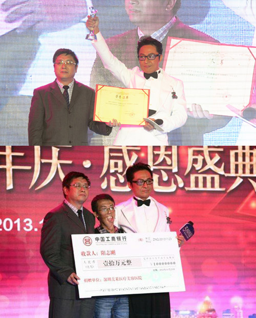 馬景濤受聘為美萊2013傳遞美麗愛無限公益行動慈善大使,深圳美萊慈善大使馬景濤與郭杰院長共同為陽志頒發(fā)10萬元公益救助基金支票。